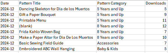 The Printables Report details the patterns and printables patrons have downloaded during a particular month, including the date, pattern title, category and number of downloads.