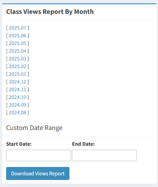 The Viewing Summary Report details the classes that patrons watched in their entirety during a particular month, including the date, class title, category, duration of viewing, number of unique class views, number of videos viewed, average viewing duration, and number of class completions.