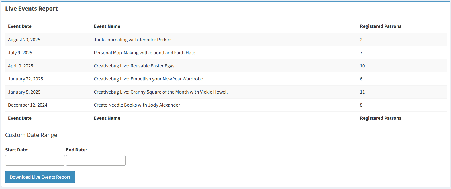 The Live Events Report summarizes the number of registrants from your library for each Live Event, including the date and event title.